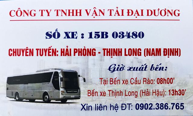 Xe Đại Dương là một nhà xe quen thuộc chuyên phục vụ tuyến Thịnh Long – Hải Hậu – Nam Định đi Bến xe Cầu Rào, Hải Phòng. Nhà xe có lịch trình chạy đều đặn mỗi ngày với hai chuyến chính: xuất phát từ Thịnh Long lúc 12h15 trưa và từ Hải Phòng lúc 6h sáng, rất thuận tiện cho hành khách di chuyển giữa hai địa phương.
